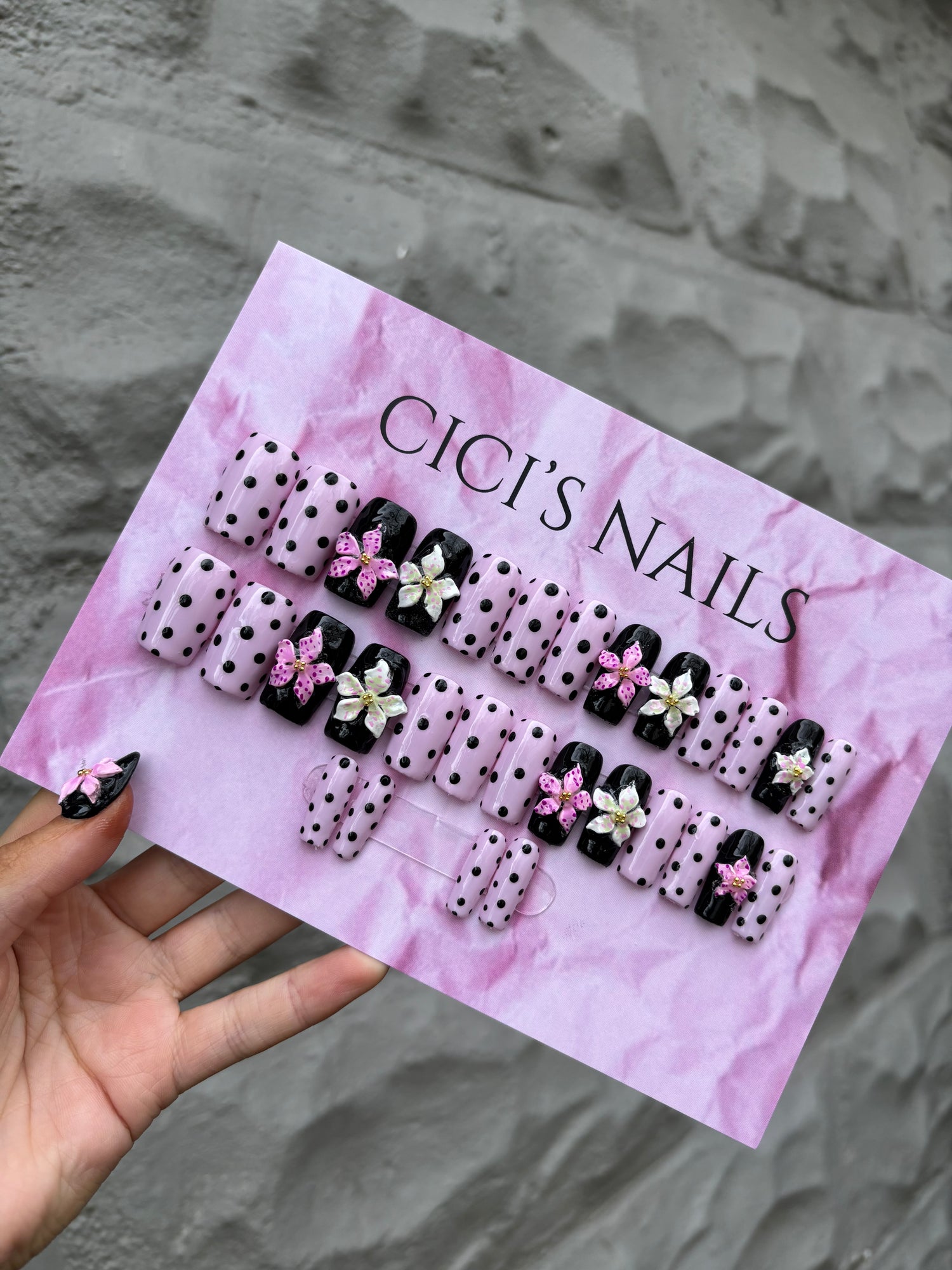 An application kit is included, which contains: a nail glue, a nail file, a cuticle pusher, and instructions. $5 off your order if you pick inspiration off of my Pinterest board, which can be found linked on my link tree "set inspiration" or follow me @Ceciliadiorio